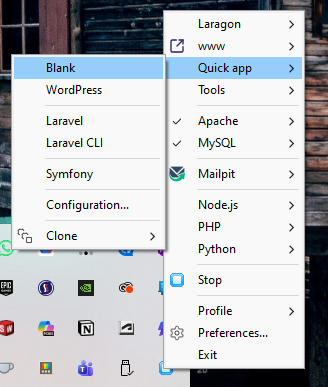 So lets start a new project – right click on the Laragon icon in your task tray, and select ‘Quick app > Blank’. In the popup box, enter a name for your project – for this tutorial I went with: simple-crud-db
