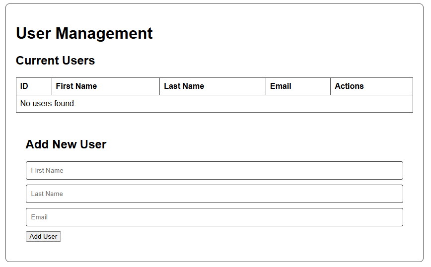 This index.php file handles two main things: reading all existing users from the database and displaying them in a table, and providing a simple form to create new users. When the form is submitted, the data is inserted, and the page redirects to itself to show the updated list.