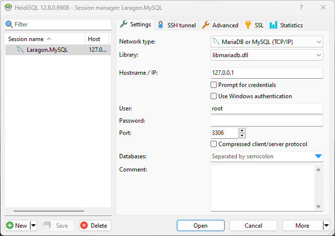 Laragon utilises HeidiSQL for database management, which it makes it very easy to manage rather than controlling databases through the commandline. In the same Laragon tray menu, when you click on ‘Tools > HeidiSQL’ button you will be presented with the below: